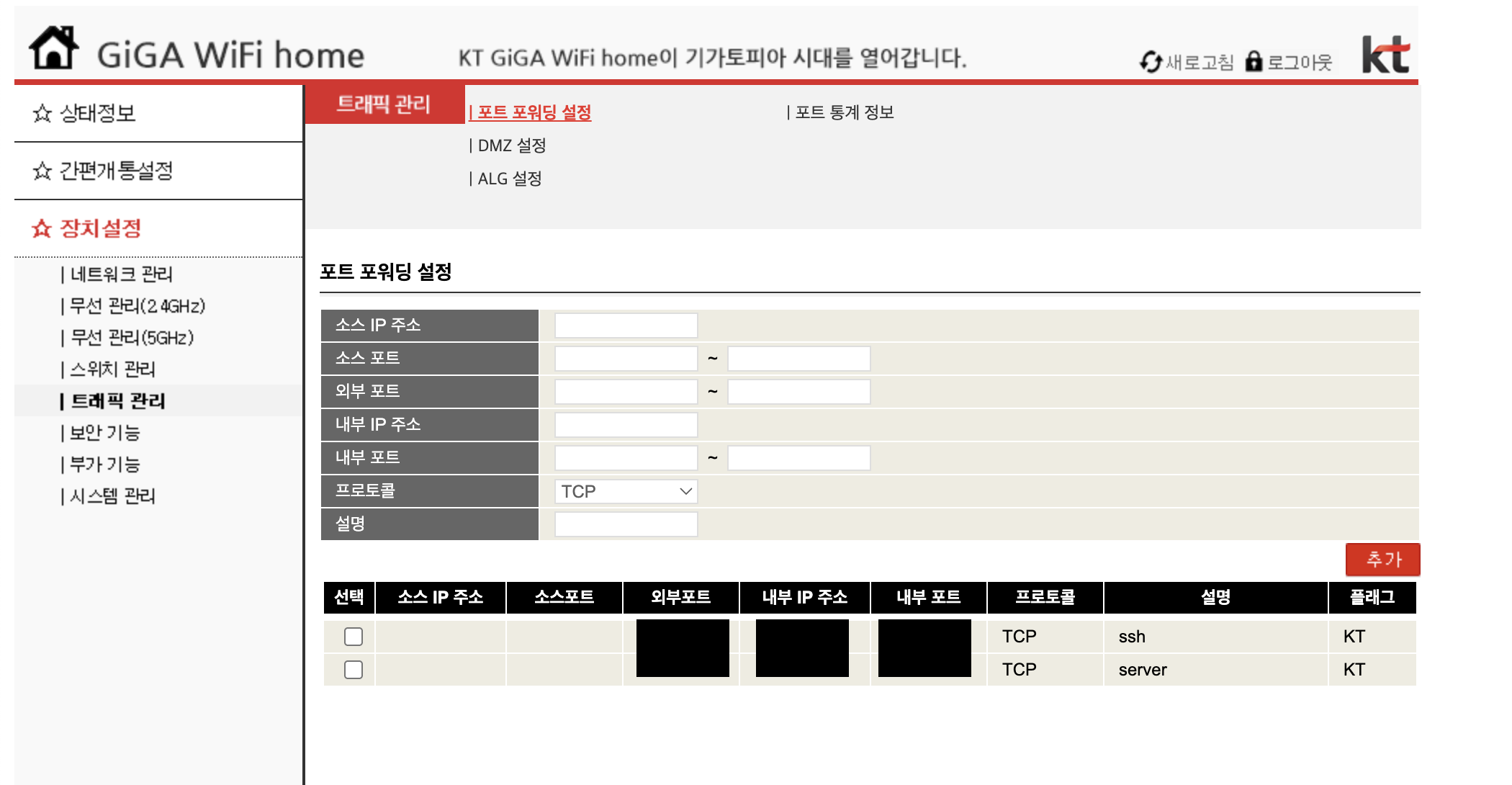KT사가 지원하는 ip에 접근하여 사용하고자 하는 포트 포워딩 설정을 해줍니다.