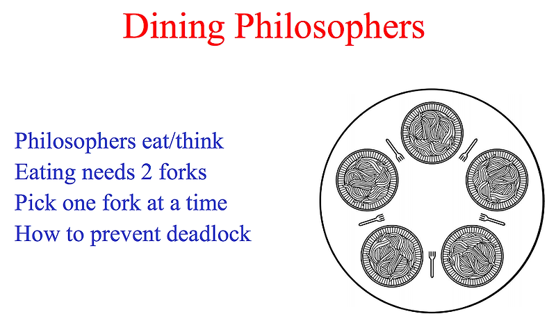 데드락을 설명하는 가장 대표적인 예시 식사하는 철학자 문제를 들여다보겠습니다.