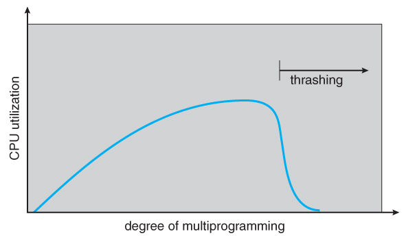 운영체제가 CPU 이용률이 낮다고 판단하여 더 많은 프로세스를 실행하면, 전역 페이지 교체 알고리즘 하에서는 실행 중인 프로세스들이 서로의 프레임을 빼앗기 시작하게 됩니다. 이로 인해 페이지 교체가 빈번해지고, CPU는 페이지 로딩만 기다리느라 유휴 상태가 되며, 전체 시스템 성능이 급락하게 됩니다.