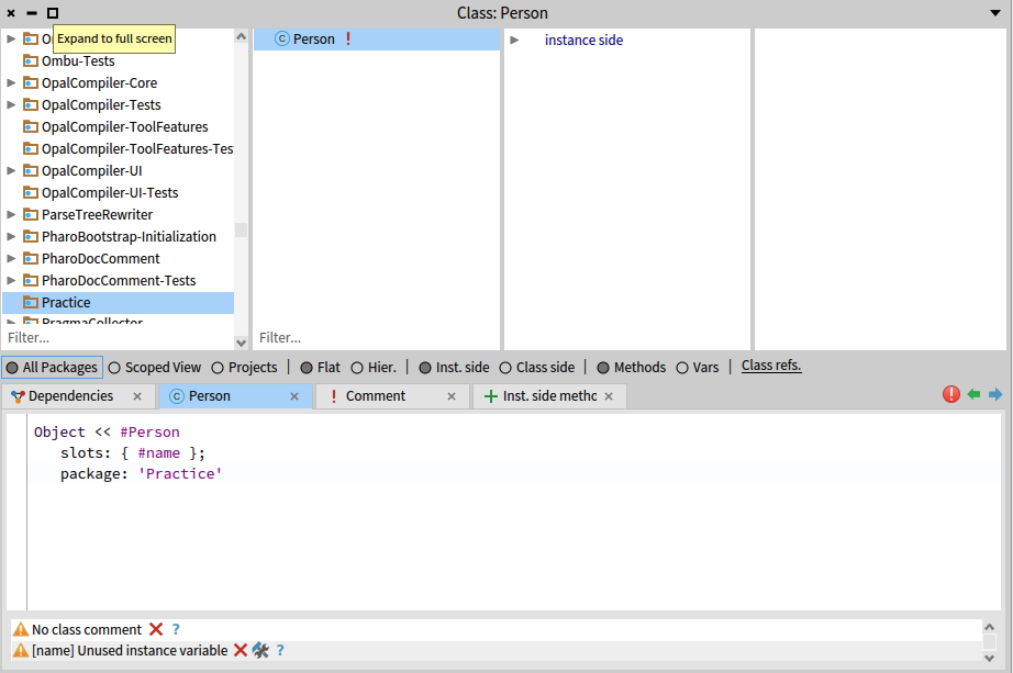System Browser에서 “class side” 버튼을 누르면 클래스 메서드를 정의할 수 있고 이게 Java의 static method와 같은 역할을 한다. 하지만 개념적으로는 “클래스 객체의 인스턴스 메서드”라고 보는 게 정확하다. 우리가 일반적으로 사용하는 것은 인스턴스 메서드, 그게 아니면 클래스 메서드. 중간에 inst.side, Class side로 나누어진 걸 볼 수 있는데 누르면서 바꾸면 된다.