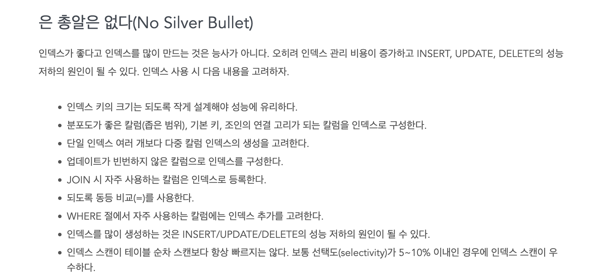 추가적으로 네이버 D2 블로그의 성능 향상을 위한 SQL 작성법에는 인덱스 사용 시 성능 저하가 발생할 수 있어 고려해야할 내용을 명시해놓은 것을 확인할 수 있었습니다.