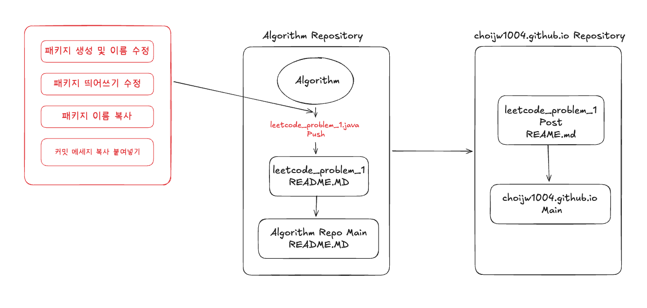 단순하게 나는 13번의 띄어쓰기를 수기로 직접 언더바 처리하거나 띄어쓰기를 해야한다. 또한 커밋 메세지 또한 직접 작성해야하는데 이를 복사, 붙여넣기 하는 과정 또한 소요시간이 꽤 걸린다. 이를 도식화 하면 다음과 같다.